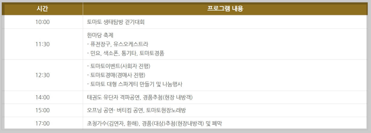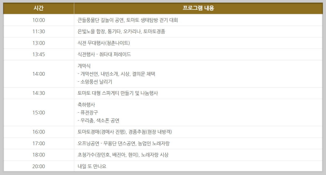 3. 주요 내용 : 개막식, 토마토이용 대형 스파게티 만들기, 토마토이용 이벤트, 부대행사, 초대가수 축하공연