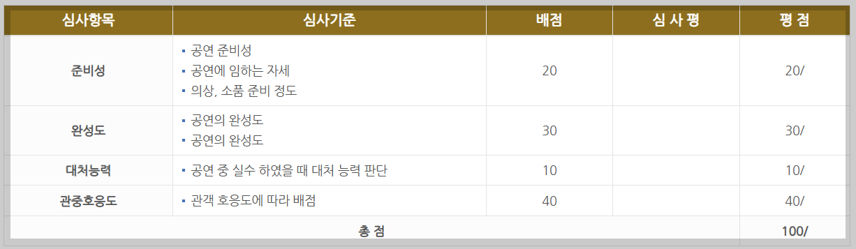 - 동점일 경우 : 관중호응도, 완성도, 준비성 순서에 따른 다득점 순으로 결정