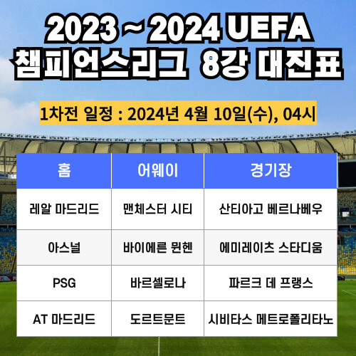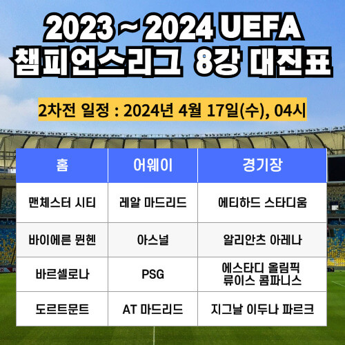 2023~2024 UEFA 챔피언스리그 8강에 진출한 팀이 결정되었습니다.