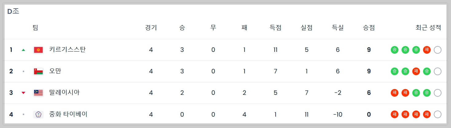 키르기스스탄이 대만을 이기고 조 1위를 지키고 있으며, 한국의 김판곤 감독이 이끄는 말레이시아가 오만에 2대 0으로 패하면서 조 3위로 내려 가 있습니다.
