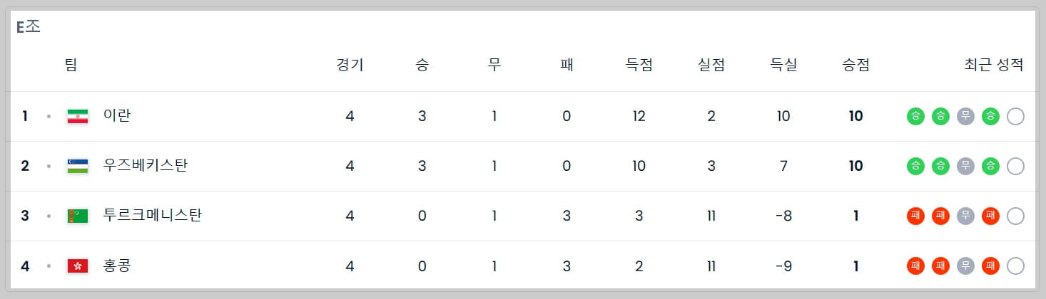 이란과 우즈베키스탄이 승점 10점으로 동률을 이루고 있으나 골 득실에서 이란이 앞서면서 조 1위를 지키고 있습니다.