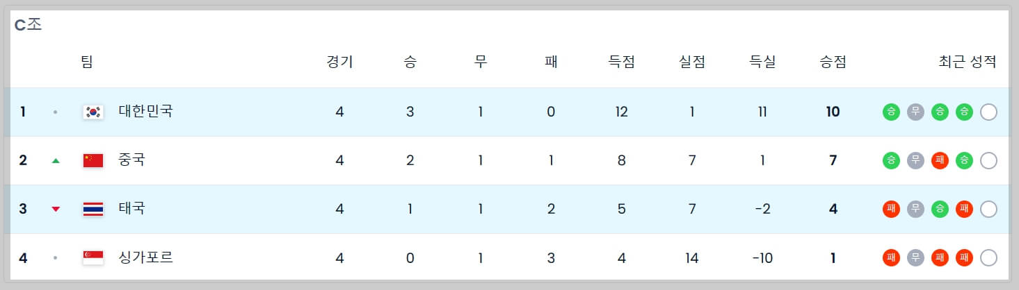 중국은 싱가포르를 4대 1로 이겨 조 2위로 올라왔네요.