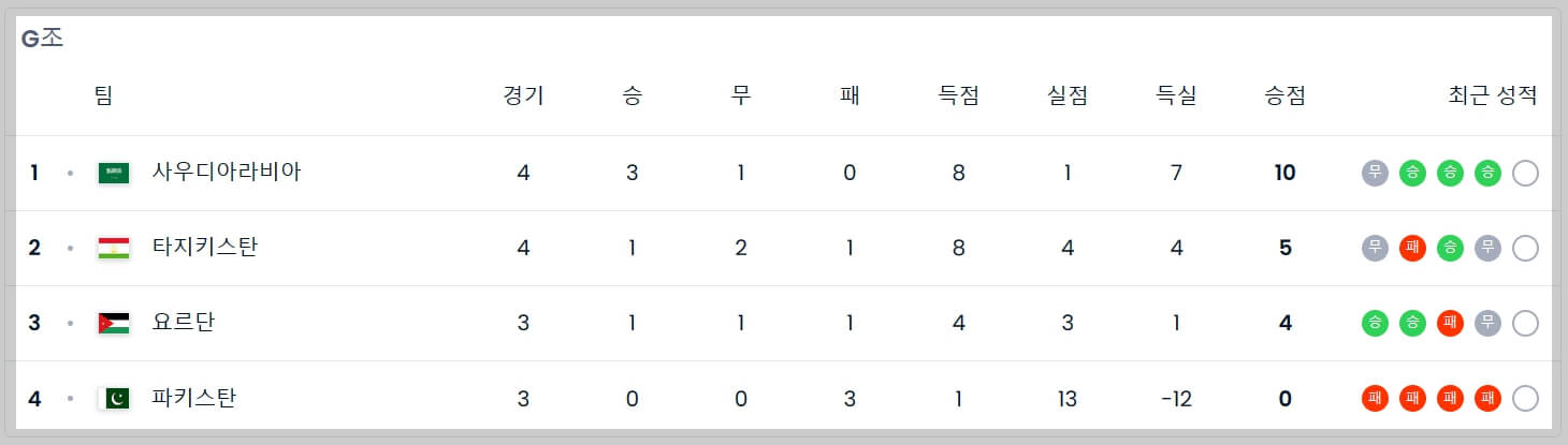 사우디아라비아가 승점 10점으로 조1위를 지키고 있으며, 타지키스탄과 요르단이 조 2위 자리를 놓고 대결을 하는 양상입니다.
