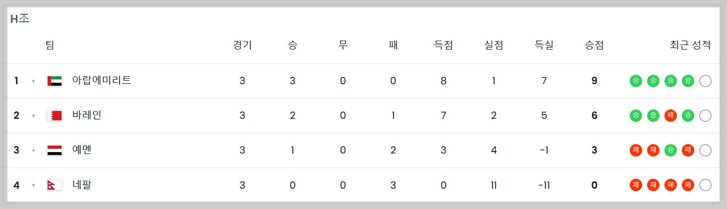 아랍에미리트가 조1위를 달리고 있으며, 이변이 없는 한 바레인까지 3차 예선에 진출 할 것으로 보입니다.