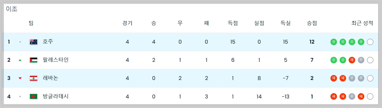호주가 승점 12점으로 조 1위가 확실한 가운데 팔레스타인도 승점 7점으로 조 2위를 달리고 있네요.