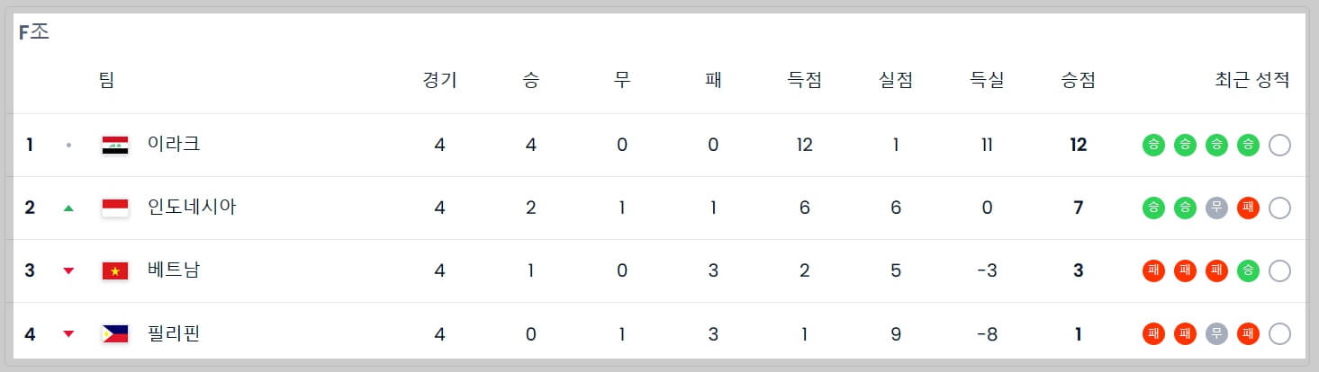 이라크가 승점 12점으로 조 1위를 차지하고 있는 가운데 신태용 감독이 이끄는 인도네시아가 베트남을 3대 0으로 이기면서 조2위가 유력시 되고 있습니다.